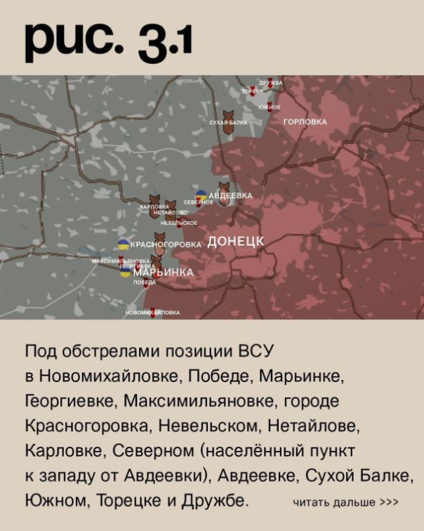 На всей протяжённости донецкого фронта на земле практическое затишье. Активно работала российская артиллерия. Под обстрелами позиции ВСУ в Новомихайловке, Победе, Марьинке, Георгиевке, Максимильяновке, городе Красногоровка, Невельском, Нетайлове, Карловке, Северном (населённый пункт к западу от Авдеевки), Авдеевке, Сухой Балке, Южном, Торецке и Дружбе. Украинские войска наносили удары по Донецку и Водяному. (Рис. 3)