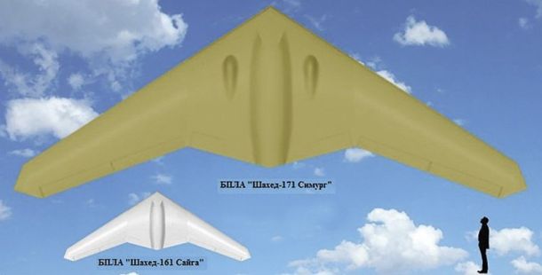 "Охотник" — новейший ударно-разведывательный БпЛА весом до 20 тонн и размахом крыльев в 19 метров. Дальность полёта до 6000 км, максимальная скорость — 1400 км/ч, боевая нагрузка — 3 тонн бомб и ракет. Источник