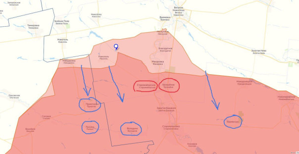Поэтому, сейчас ВСУ наступают по флангам, стараясь взять высоты, в направлении на Приютное и Володино на западном фланге и в направлении на Октябрьское на восточном.