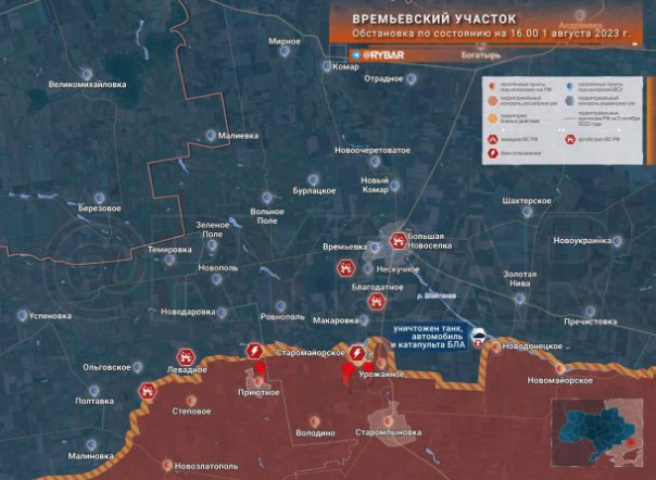 - Неожиданно для ВСУ российские войска не отошли с Времьевского выступа на первый рубеж обороны проходящий южнее Старомлыновки. А приняли бой в жесткой обороне в довольно неудобном для обороны месте. Это явилось полной неожиданностью для НАТО и ВСУ и серьезно поломало планы. Вместо победных реляций и очередных рассказов о том что российские войска бегут появились кадры сожженной техники ВСУ, а темп наступления был серьезно сбит. Используя численное превосходство ВСУ конечно продавливают линию фронта но ценой серьезных потерь в личном составе и техники. И если начав 4 июня уже к середине июня ВСУ планировали занять Старомлыновку и концентрируясь там приступить к прорыву основной линии обороны, то фактически на сегодня они смогли лишь продвинуться на рубеж Приютное-Старомайорское.
