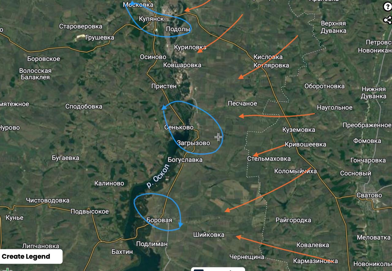 Далее рубеж Боровое, Сеньковка, Купянск - на него еще не вышли, но войска уже подошли и заняли исходные позиции. Занятие этого рубежа означает ликвидацию группировки врага на правом берегу реки Оскол, и выход к рубежу Славянск- Изюм - та самая трасса М -03 на которой висит все харьковское снабжение. Карта 4