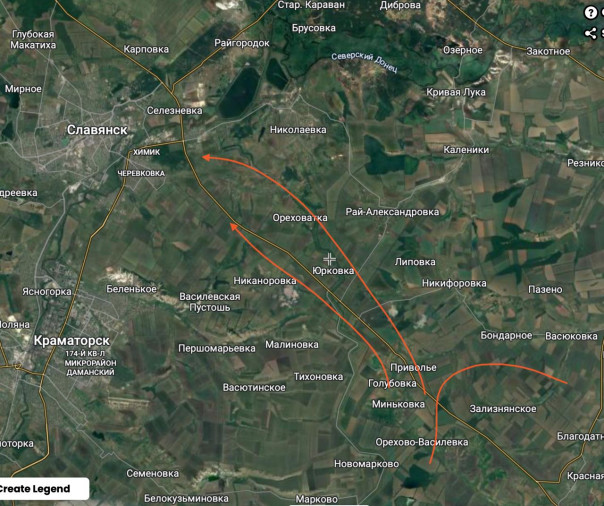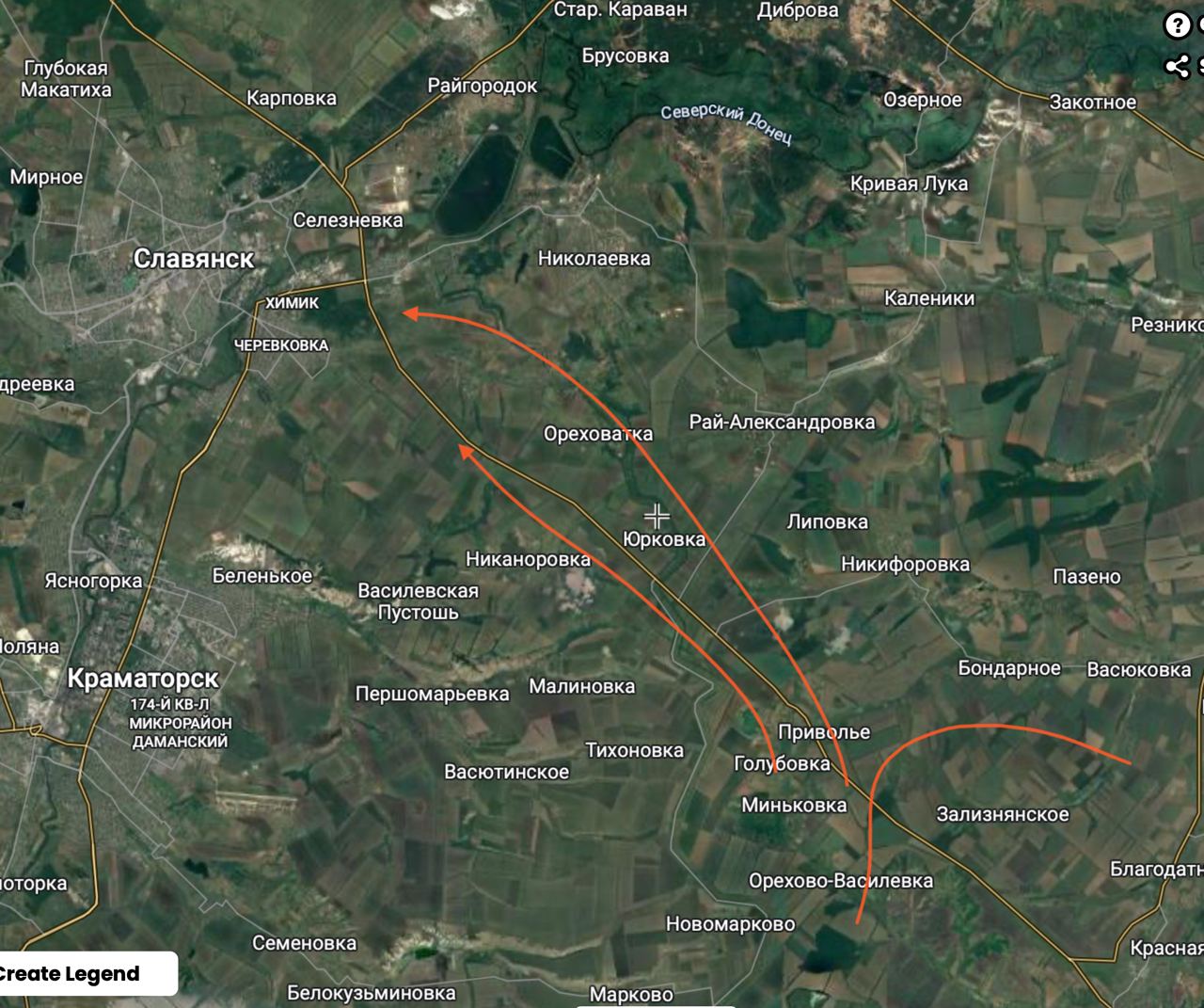 - на ряде стратегических направлениях в ходе весенне-летнего наступления мы заняли удобные исходные рубежи. Часть из них я перечислял. Это например позиция на трассе М-03 возле деревни Орехово Васильевка, открывающее дорогу на Славянск и Краматорск. (Карта 1)