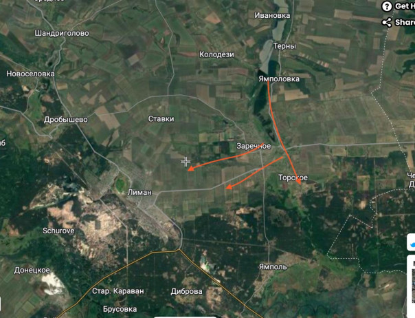 Далее рубеж Диброво, Торское Ямполовка - это исходный пункт для атаки на Красный Лиман, взятие которого берет в клещи Славянск. Карта 3
