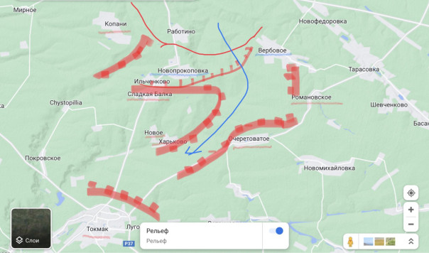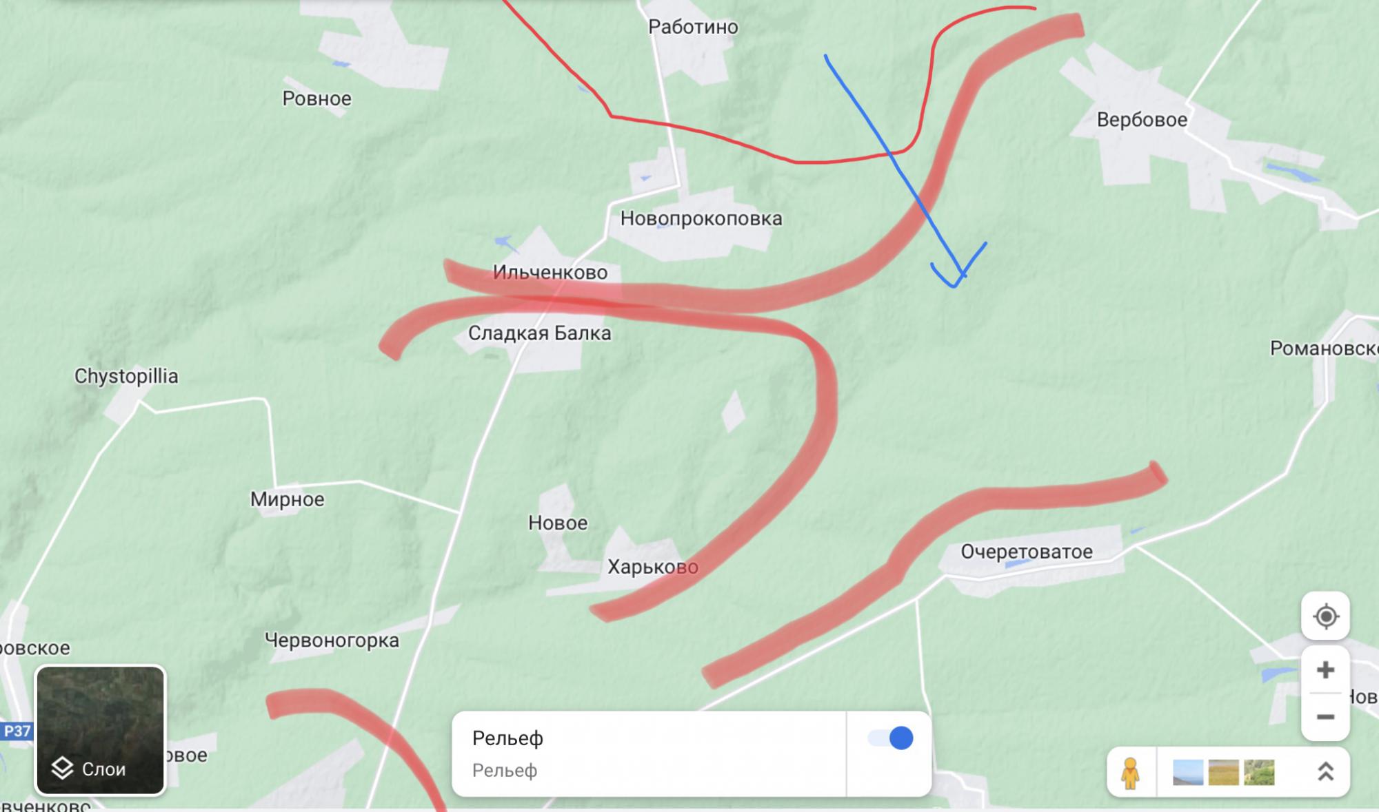 ВСУ придется идти к Токмаку по узкой долине, меж высот, на технике (я уверен саперы там уже стараются).