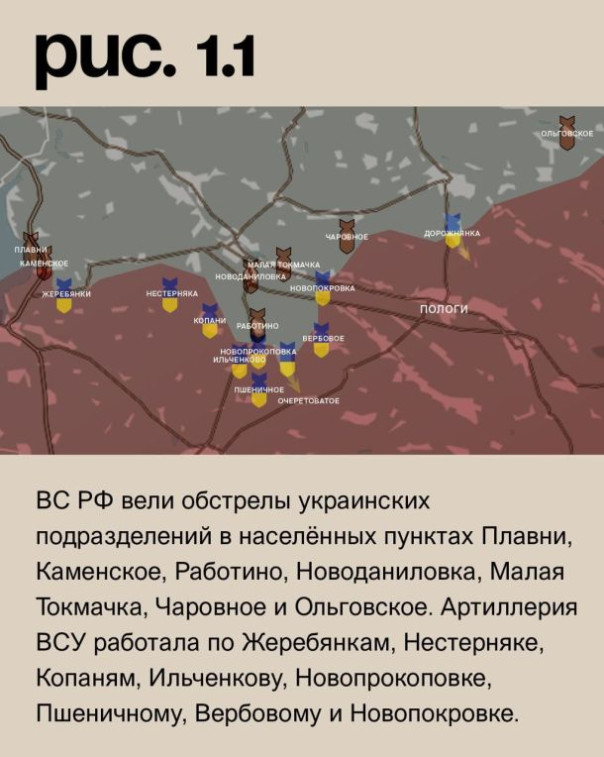 На Запорожском направлении ВСУ при поддержке артиллерии атаковали к востоку от Новпрокоповки в направлении Очеретоватого. Есть продвижение в «серой зоне». Аналогичные действия они вели в районе Дорожнянки. Это новый активный участок боевых действий. ВС РФ вели обстрелы украинских подразделений в населённых пунктах Плавни, Каменское, Работино, Новоданиловка, Малая Токмачка, Чаровное и Ольговское. Артиллерия ВСУ работала по Жеребянкам, Нестерняке, Копаням, Ильченкову, Новопрокоповке, Пшеничному, Вербовому и Новопокровке. (Рис. 1)