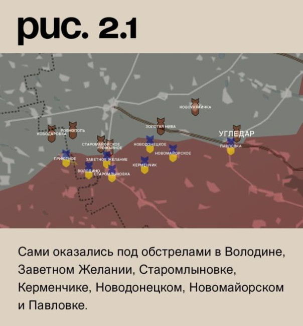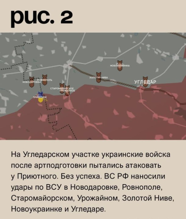 На Угледарском участке украинские войска после артподготовки пытались атаковать у Приютного. Без успеха. ВС РФ наносили удары по ВСУ в Новодаровке, Ровнополе, Старомайорском, Урожайном, Золотой Ниве, Новоукраинке и Угледаре. Сами оказались под обстрелами в Володине, Заветном Желании, Старомлыновке, Керменчике, Новодонецком, Новомайорском и Павловке. (Рис. 2)