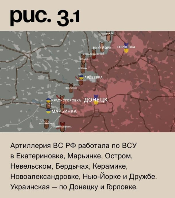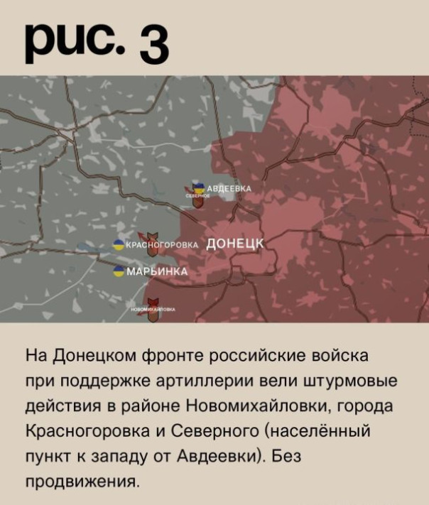 На Донецком фронте российские войска при поддержке артиллерии вели штурмовые действия в районе Новомихайловки, города Красногоровка и Северного (населённый пункт к западу от Авдеевки). Без продвижения. Артиллерия ВС РФ работала по ВСУ в Екатериновке, Марьинке, Остром, Невельском, Бердычах, Керамике, Новоалександровке, Нью-Йорке и Дружбе. Украинская – по Донецку и Горловке. (Рис. 3)