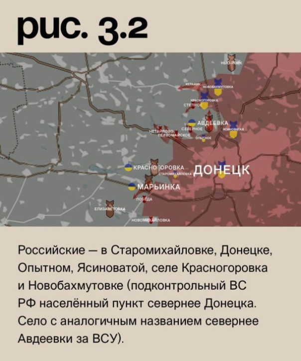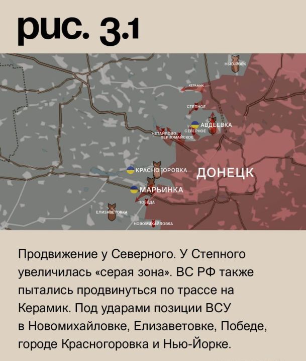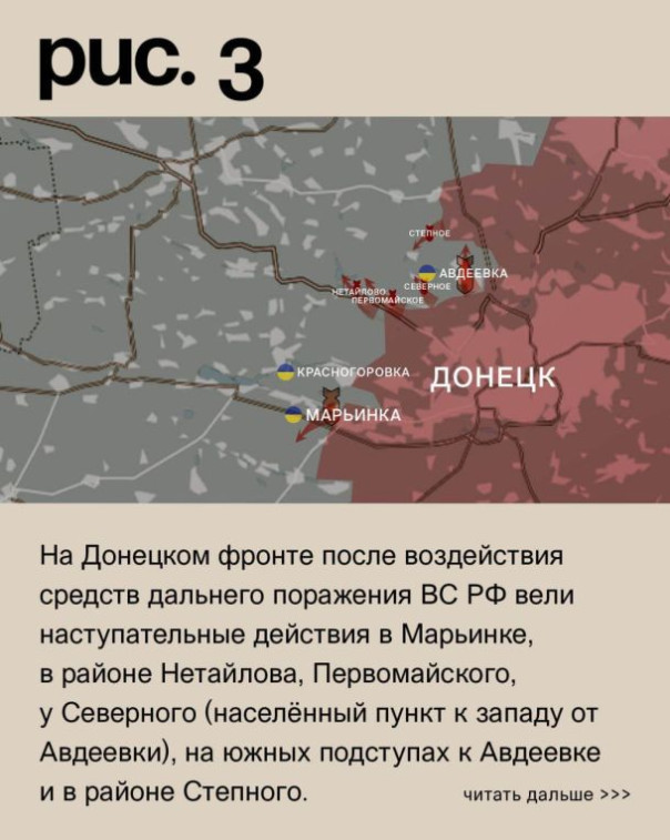 На Донецком фронте после воздействия средств дальнего поражения ВС РФ вели наступательные действия в Марьинке, в районе Нетайлова, Первомайского, у Северного (населённый пункт к западу от Авдеевки), на южных подступах к Авдеевке и в районе Степного. Продвижение у Северного. У Степного увеличилась «серая зона». ВС РФ также пытались продвинуться по трассе на Керамик. Под ударами позиции ВСУ в Новомихайловке, Елизаветовке, Победе, городе Красногоровка и Нью-Йорке. Российские – в Старомихайловке, Донецке, Опытном, Ясиноватой, селе Красногоровка и Новобахмутовке (подконтрольный ВС РФ населённый пункт севернее Донецка. Село с аналогичным названием севернее Авдеевки за ВСУ). (Рис. 3)