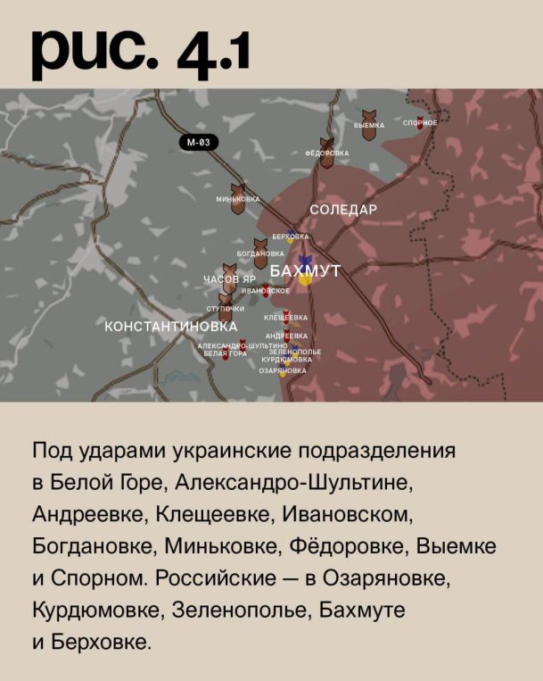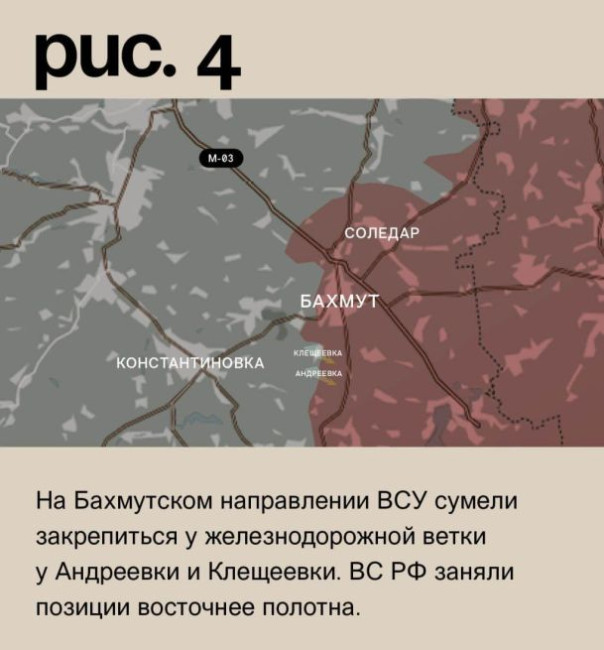 На Бахмутском направлении ВСУ сумели закрепиться у железнодорожной ветки у Андреевки и Клещеевки. ВС РФ заняли позиции восточнее полотна. Под ударами украинские подразделения в Белой Горе, Александро-Шультине, Андреевке, Клещеевке, Ивановском, Богдановке, Миньковке, Фёдоровке, Выемке и Спорном. Российские – в Озаряновке, Курдюмовке, Зеленополье, Бахмуте и Берховке. (Рис. 4)
