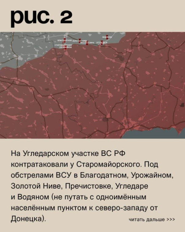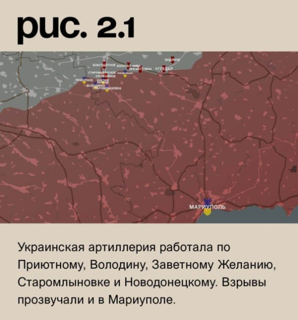 На Угледарском участке ВС РФ контратаковали у Старомайорского. Под обстрелами ВСУ в Благодатном, Урожайном, Золотой Ниве, Пречистовке, Угледаре и Водяном (не путать с одноимённым населённым пунктом к северо-западу от Донецка). Украинская артиллерия работала по Приютному, Володину, Заветному Желанию, Старомлыновке и Новодонецкому. Взрывы прозвучали и в Мариуполе. (Рис. 2)