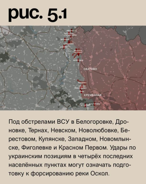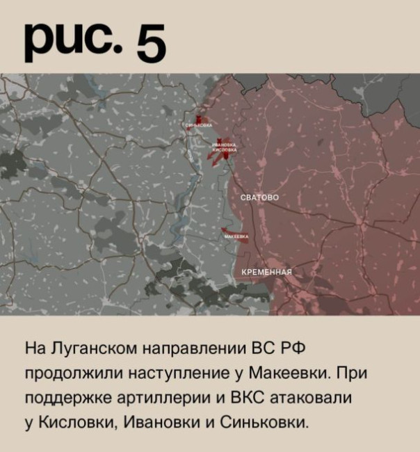 На Луганском направлении ВС РФ продолжили наступление у Макеевки. При поддержке артиллерии и ВКС атаковали у Кисловки, Ивановки и Синьковки. Под обстрелами ВСУ в Белогоровке, Дроновке, Тернах, Невском, Новолюбовке, Берестовом, Купянске, Западном, Новомлынске, Фиголевке и Красном Первом. Удары по украинским позициям в четырёх последних населённых пунктах могут означать подготовку к форсированию реки Оскол. (Рис. 5)