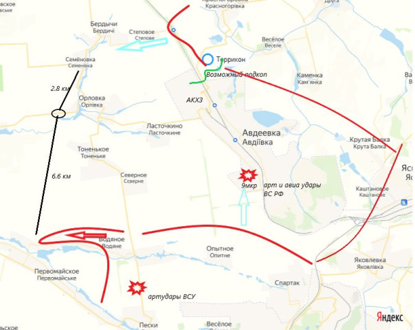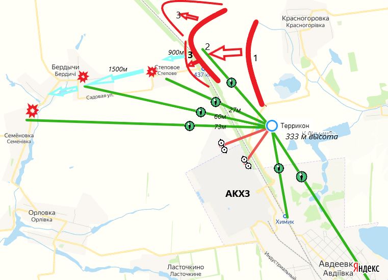 Были непонятные украинские сообщения про подкопы. Его я нарисовал зеленым - от террикона в промку, там наверняка полно подземных коммуникаций (моя версия места копания) . Может АКХЗ просто возьмут под плотный огневой контроль, не знаю