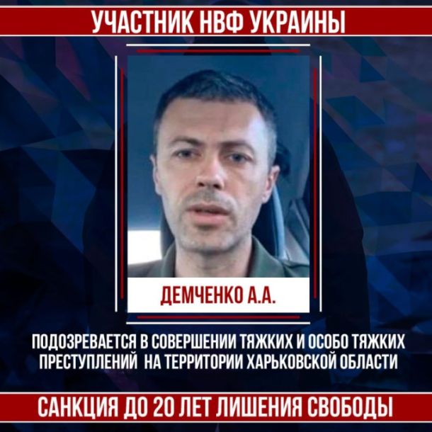 Российские правоохранители продолжают разыскивать на территории Харьковской области участников незаконных вооружённых формирований Украины, совершивших тяжкие и особо тяжкие преступления. Так, в совершении преступлений, предусмотренных ч.5 ст.33, ч.2 ст.119, п.«б» ч.2 ст.158, ст.166, ст.167, ст.276 Уголовного кодекса Российской Федерации подозревается гражданин Украины, участник незаконного вооружённого формирования Андрей Александрович Демченко, который занимает должность «представителя государственной пограничной службы Украины в Харьковской области». Санкции статей за совершённые преступления предусматривают наказание до двадцати лет лишения свободы.