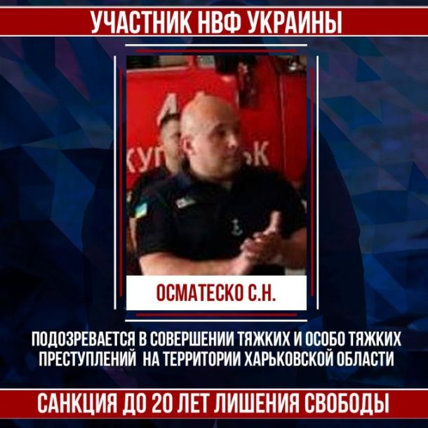 В совершении тяжких и особо тяжких преступлений, предусмотренных ч.5 ст.33, ч.2 ст.119, п.«б» ч.2 ст.158, ст.166, ст.167, ст.276 УК РФ подозревается гражданин Украины, участник ВФУ Сергей Николаевич Осматеско, занимающий должность «заместителя начальника Купянского РУ ГУ ГСЧС Украины в Харьковской области». Санкции статей за совершенные преступления предусматривают наказание до 20 лет лишения свободы.