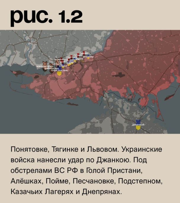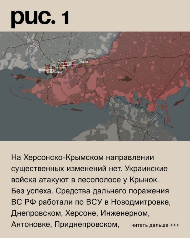 На Херсонско-Крымском направлении существенных изменений нет. Украинские войска атакуют в лесополосе у Крынок. Без успеха. Средства дальнего поражения ВС РФ работали по ВСУ в Новодмитровке, Днепровском, Херсоне, Инженерном, Антоновке, Приднепровском, Понятовке, Тягинке и Львовом. Украинские войска нанесли удар по Джанкою. Под обстрелами ВС РФ в Голой Пристани, Алёшках, Пойме, Песчановке, Подстепном, Казачьих Лагерях и Днепрянах. (Рис. 1)
