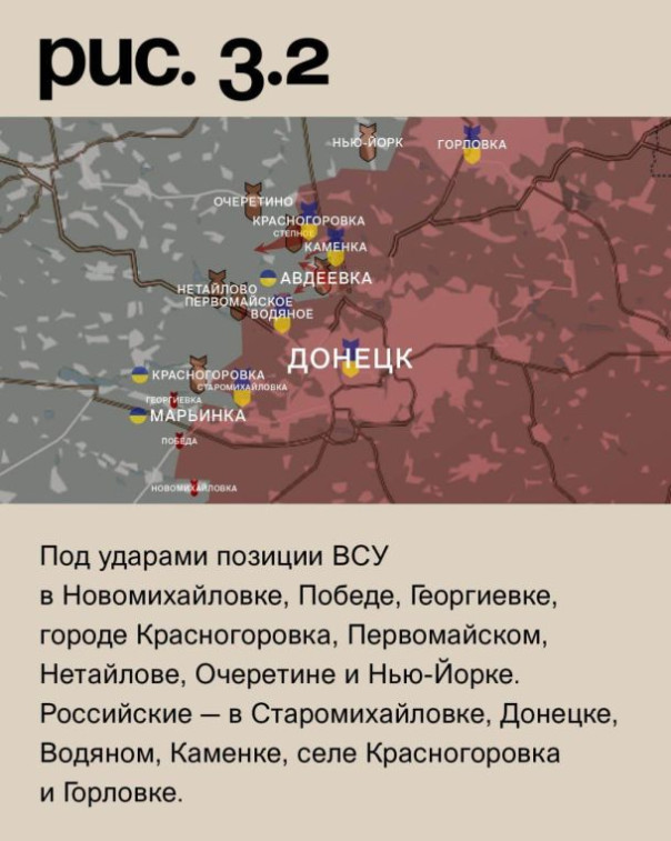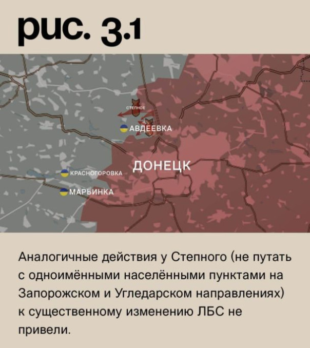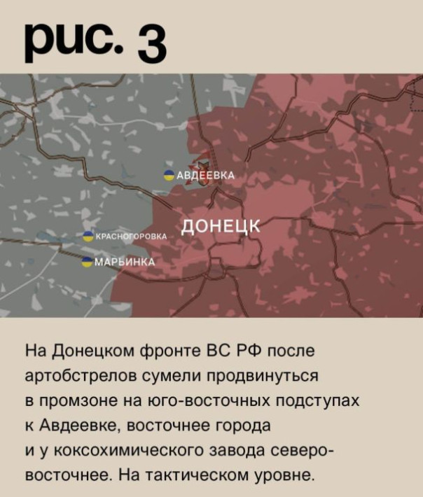На Донецком фронте ВС РФ после артобстрелов сумели продвинуться в промзоне на юго-восточных подступах к Авдеевке, восточнее города и у коксохимического завода северо-восточнее. На тактическом уровне. Аналогичные действия у Степного (не путать с одноимёнными населёнными пунктами на Запорожском и Угледарском направлениях) к существенному изменению ЛБС не привели. Под ударами позиции ВСУ в Новомихайловке, Победе, Георгиевке, городе Красногоровка, Первомайском, Нетайлове, Очеретине и Нью-Йорке. Российские – в Старомихайловке, Донецке, Водяном, Каменке, селе Красногоровка и Горловке. (Рис. 3)
