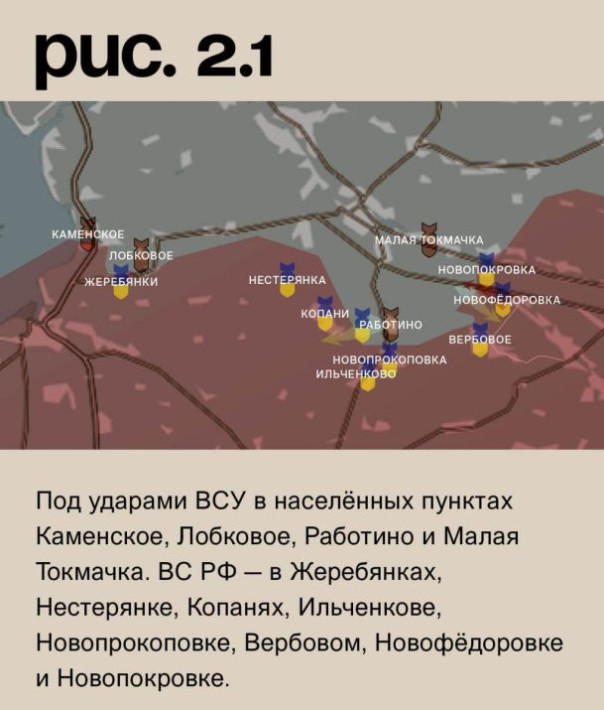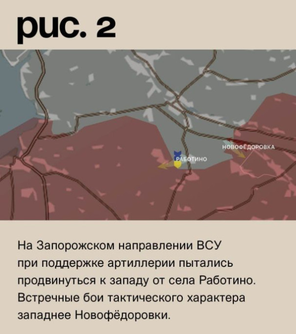 На Запорожском направлении ВСУ при поддержке артиллерии пытались продвинуться к западу от села Работино. Встречные бои тактического характера западнее Новофёдоровки. Под ударами ВСУ в населённых пунктах Каменское, Лобковое, Работино и Малая Токмачка. ВС РФ – в Жеребянках, Нестерянке, Копанях, Ильченкове, Новопрокоповке, Вербовом, Новофёдоровке и Новопокровке. (Рис. 2)