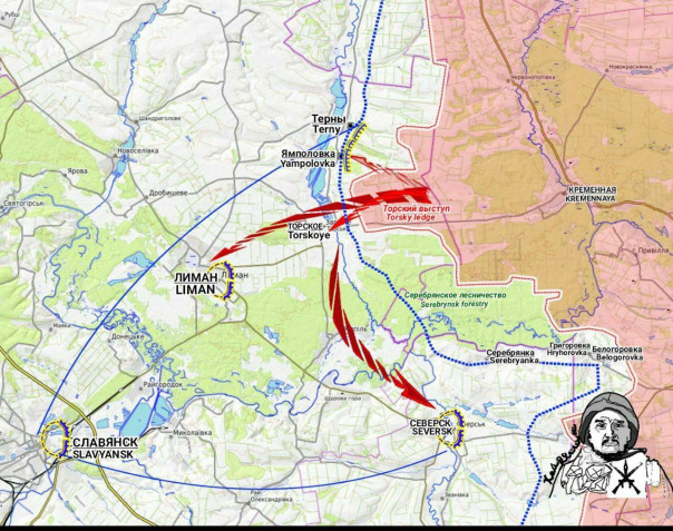 Торский выступ: здесь прорыв возможен сразу в трех направлениях - Торское с выходом на Северск, непосредственно Красный Лиман, и в сторону Ямполовки с целью блокирования основных переправ через Жеребец.