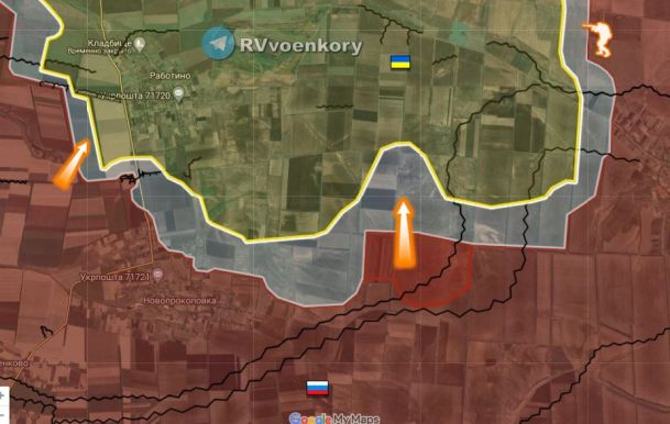 "Российские войска продолжают давить западнее Работино и в северном направлении между Новопрокоповкой и Вербовым.