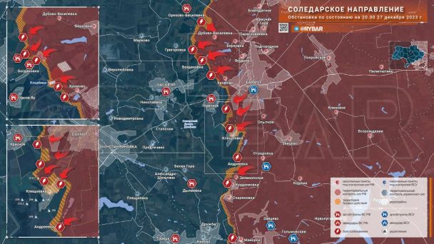 С востока Часов Яр прикрыт цепью укреплений, расположенных вдоль береговой линии канала Северский Донец - Донбасс. Сам город расположен на высотах, и на северо-востоке, в т.ч. «зеленке», подступы к нему перекрыты четырьмя опорниками. Вместе с тем, удар по КП ОТГ «Соледар» от 24.12.2023 на восточном фасе Часов Яра, о котором мы вскользь написали в предыдущем посте, заставил понервничать командование противника. За этим последовал вход подразделений ВС РФ в пределы Богдановки одновременно с артналётом и применением РСЗО по позициям ВСУ в северной части населённика (данные факты подтверждают и украинские OSINT-ресурсы «DeepStateUA» и «Ukrdailyupdate»). Но обстановка тут по-прежнему тяжелая.