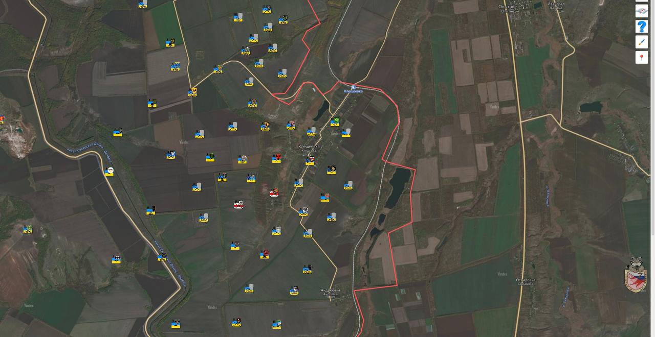 На южном фланге существенных изменений нет: российские войска по-прежнему удерживают господствующую высоту 215.7 на северо-западной окраине Клещеевки и наносят огневое поражение по скоплениям сил противника.