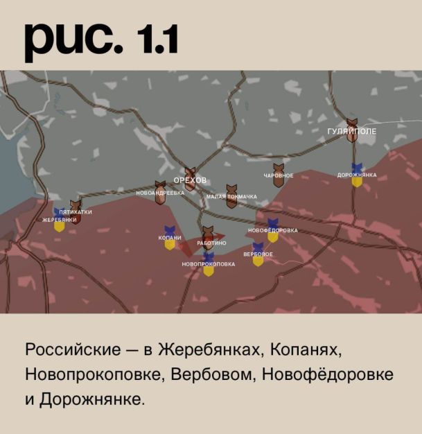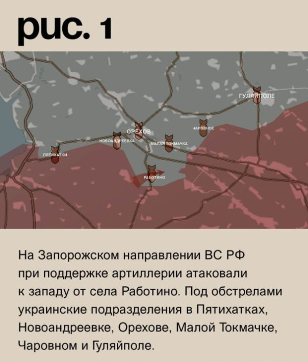 На Запорожском направлении ВС РФ при поддержке артиллерии атаковали к западу от села Работино. Под обстрелами украинские подразделения в Пятихатках, Новоандреевке, Орехове, Малой Токмачке, Чаровном и Гуляйполе. Российские – в Жеребянках, Копанях, Новопрокоповке, Вербовом, Новофёдоровке и Дорожнянке. (Рис. 1)