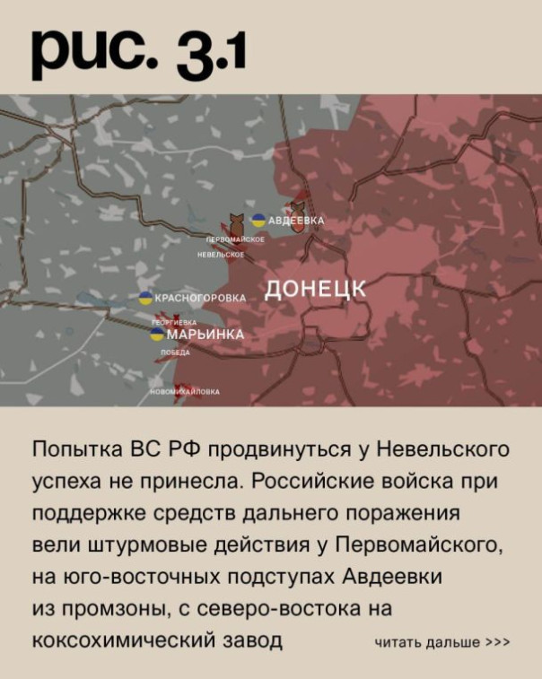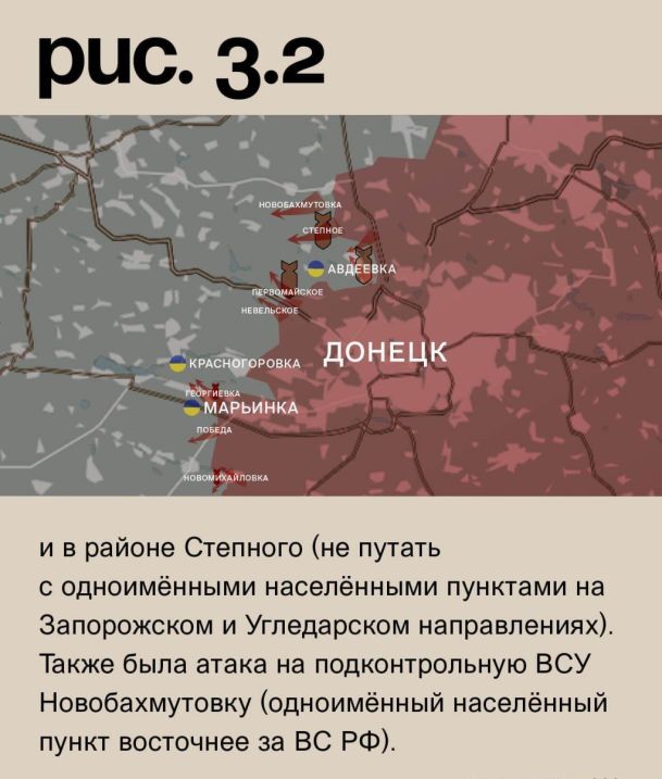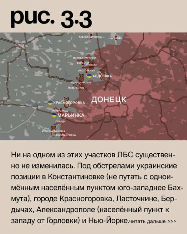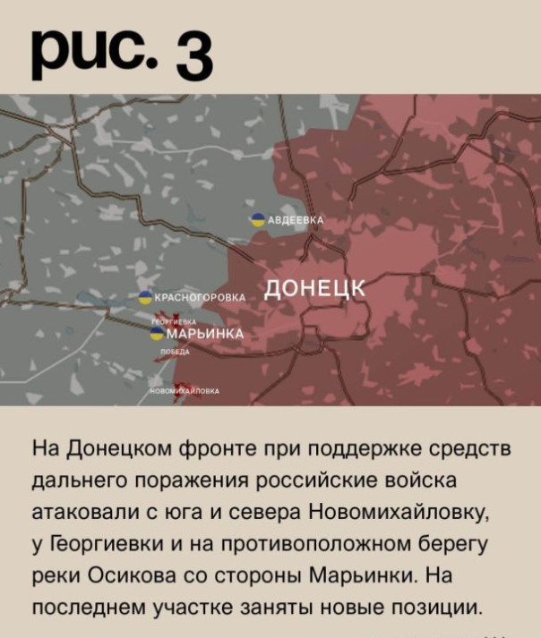 На Донецком фронте при поддержке средств дальнего поражения российские войска атаковали с юга и севера Новомихайловку, у Георгиевки и на противоположном берегу реки Осикова со стороны Марьинки. На последнем участке заняты новые позиции. Попытка ВС РФ продвинуться у Невельского успеха не принесла. Российские войска при поддержке средств дальнего поражения вели штурмовые действия у Первомайского, на юго-восточных подступах Авдеевки из промзоны, с северо-востока на коксохимический завод и в районе Степного (не путать с одноимёнными населёнными пунктами на Запорожском и Угледарском направлениях). Также была атака на подконтрольную ВСУ Новобахмутовку (одноимённый населённый пункт восточнее за ВС РФ). Ни на одном из этих участков ЛБС существенно не изменилась. Под обстрелами украинские позиции в Константиновке (не путать с одноимённым населённым пунктом юго-западнее Бахмута), городе Красногоровка, Ласточкине, Бердычах, Александрополе (населённый пункт к западу от Горловки) и Нью-Йорке. Российские – в Марьинке, Старомихайловке, Донецке, Водяном, селе Красногоровка и Горловке. (Рис. 3)