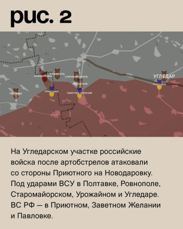На Угледарском участке российские войска после артобстрелов атаковали со стороны Приютного на Новодаровку. Под ударами ВСУ в Полтавке, Ровнополе, Старомайорском, Урожайном и Угледаре. ВС РФ – в Приютном, Заветном Желании и Павловке. (Рис. 2)