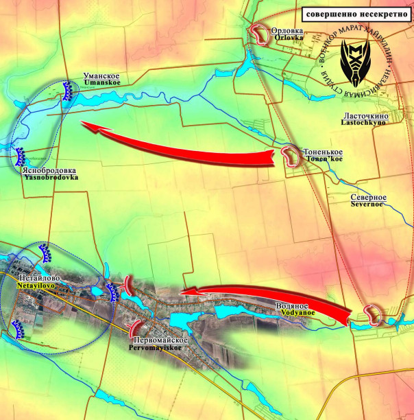 Здесь напомню, что Водяное, Первомайское и Нетайлово это фактически единая агломерация - они плавно переходят одно в другое. И последние наиболее сильные укрепления у врага остались именно между поселками Водяное и Первомайское. Их взятие означает, что штурм Первомайского переходит в финальную стадию.