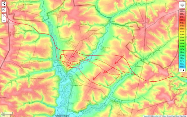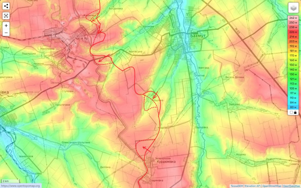 Если посмотреть на рельефную карту, то мы увидим, что наши штурмовики взяли под контроль опорники противника на высотах, подходя таким образом в Калиново с юго-востока. Одновременно с этим уже сегодня утром мы продолжили давить на противника между Новоалександровкой и Архангельским.