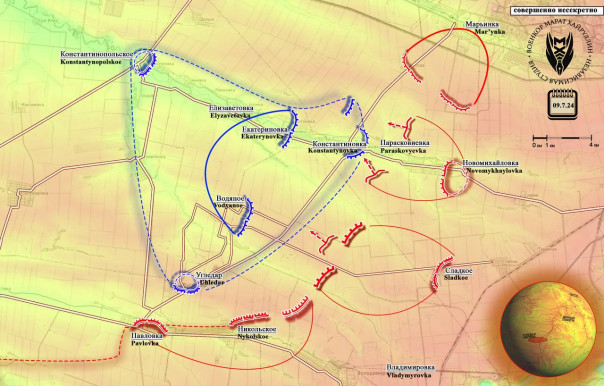 Продолжают приближаться наши подразделения и к трассе Константиновка- Угледар. Особенно значительное продвижение отмечено в районе Владимировки, где наши воины расширили контроль северо-западнее и севернее карьера.