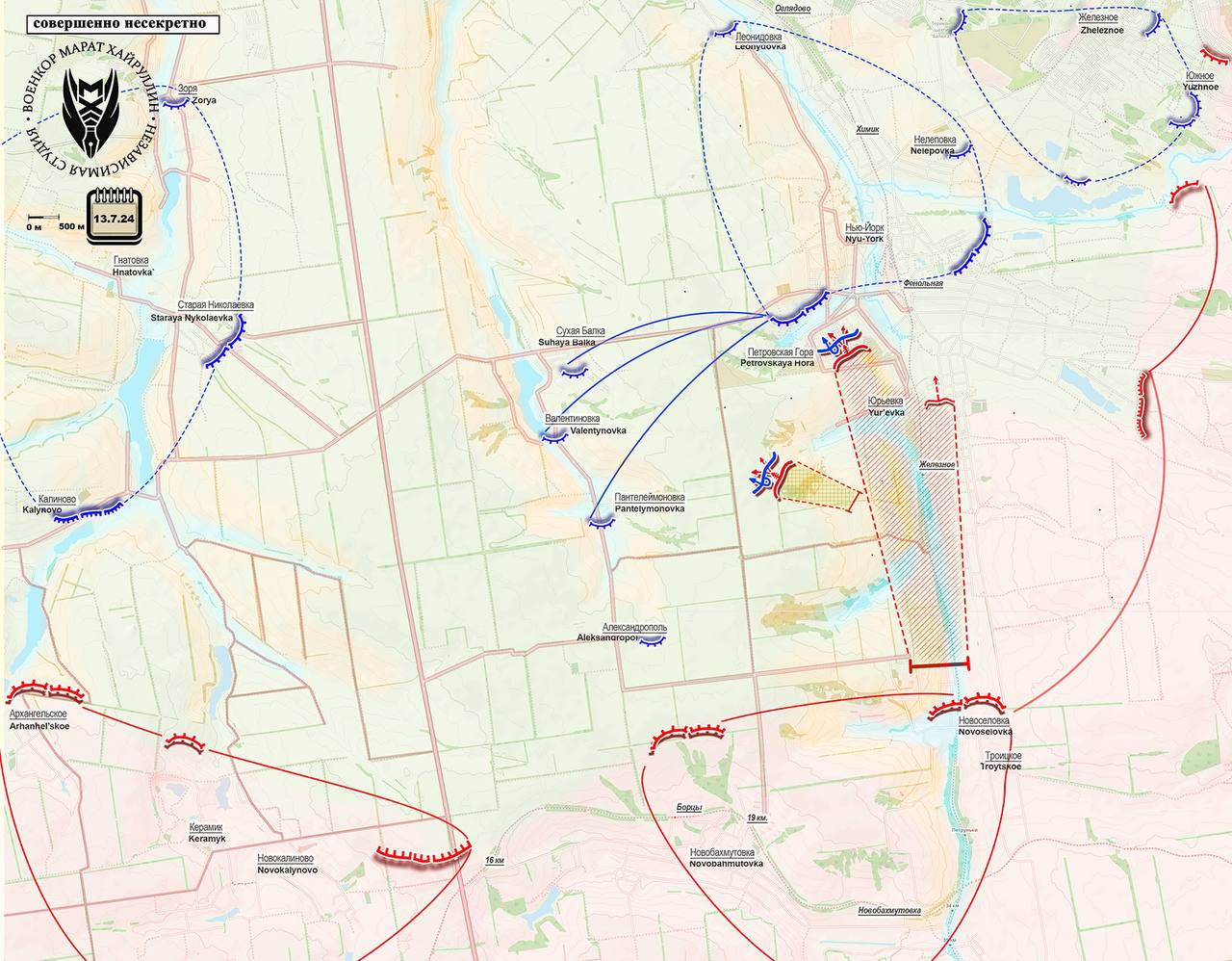 На Торецком участке Донецкого направления в н.п.Новгородское ( Нью-Йорк) продолжаются бои за центральную часть села. Также наши бойцы выбивают противника с позиций в южной части села, расширяя контроль по ул.Железная, и уже продвинулись по одной из лесополос на запад в сторону высот, лежащих между Новгородским и Пантелеймоновкой, а сейчас продолжают расширять контроль в западном направлении южнее Юрьевки.