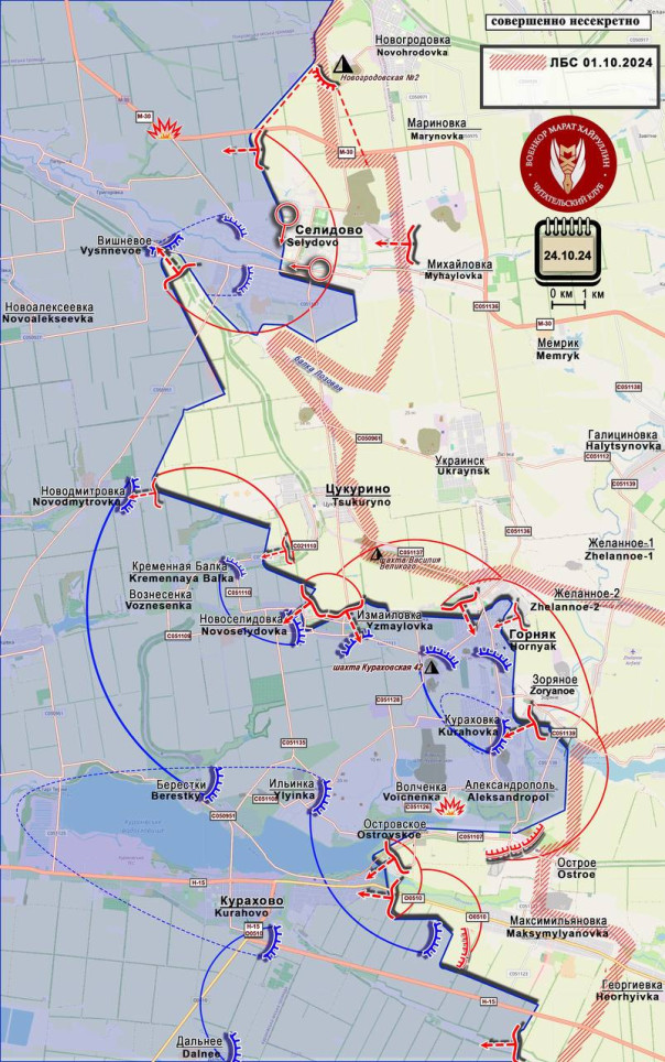Южнее, после взятия под контроль территории птицефабрики возле Цукурино, подразделения РФ вышли к Новодмитровке, на окраинах которой уже идут бои. Противник пытается предотвратить дальнейшее окружение района севернее Кураховского водохранилища с выходом на обход самого Курахово.