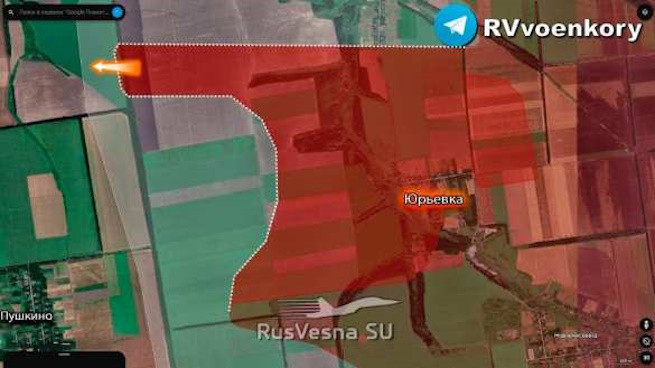 ► закрепились в Юрьевке и продвинулись западнее на глубину до 2.7 км, также продвинулись севернее н. п. Заря вдоль лесополос на участке шириной до 3.15 км на глубину до 1.5 км;