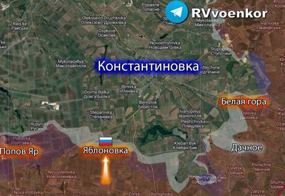 Группировка «Центр» расширяет зону контроля на подступах к Константиновке и постепенно отрезает город от «большой земли». По сути, у гарнизона осталась только одна логистическая артерия – трасса Н-20 на Дружковку. Видимо, по ней и будут уходить на север подразделения ВСУ, обороняющие Константиновку, когда их положение станет безвыходным.
