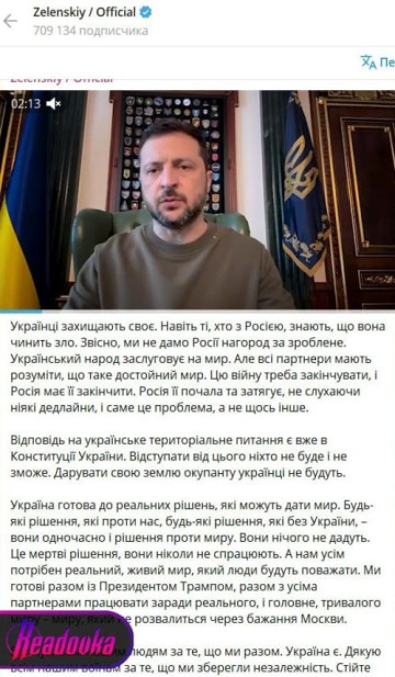 После заявлений президента США Дональда Трампа о возможных уступках территорий со стороны Украины Зеленский в своем Телеграм-канале ответил, что Киев не намерен отдавать свои территории РФ. По его словам, Украина не собирается якобы вознаграждать Россию. Кроме того, он добавил, что ответ на территориальный вопрос уже существует в конституции Украины, и ничего с этим не сделаешь.