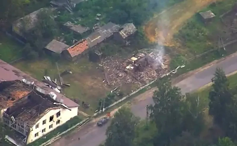 На кадрах второго ролика показаны результаты огневого поражения подразделения спецназа ГУР с применением БПЛА-камикадзе семейства «Герань» в населённом пункте Кривоносовка в Сумской области Украины. Село находится в менее чем 20 км от российской границы и также окружено лесистой местностью.