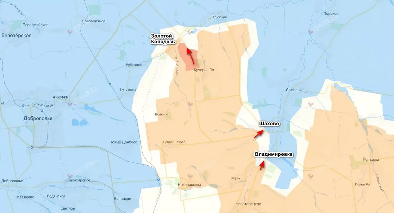 В Золотой Колодезь наши вошли вчера, заняв южную часть села и часть центральной, начав бои за овладение данным населенным пунктом. Также активные боевые действия идут на восточном фланге Добропольского выступа, где наши пытаются взять Владимировку и Шахово. Противник оказывает ожесточенное сопротивление.