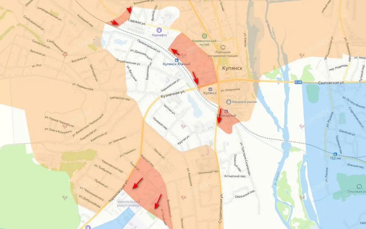 Штурмовые подразделения ВС РФ продолжают выбивать украинские формирования из Купянска. После того как наши взяли территорию в районе авторынка, им удалось перейти железную дорогу в районе ж/д станции Эстакадная (Эстакадный) и взять под контроль квартал между улицами Студенческая и Григория Сковороды. Кроме того, к северу от улицы Кузнечной под наш контроль перешла довольно большая территория, включая здание вокзала Купянск — Южный.