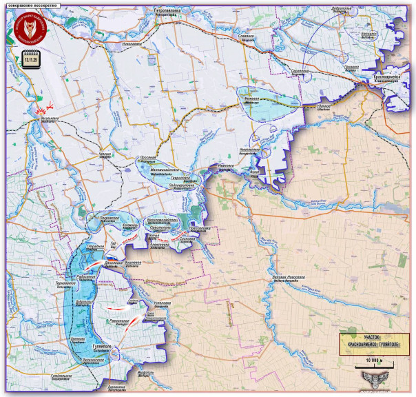 Перерезана одна из основных рокад этого направления - трасса Р-85 (Васильковка – Покровское - Гуляйполе). И одновременно в ночь с 12 на 13 ноября нанесен массированный воздушный удар по узловому транспортному району ВСУ - Васильковка.
