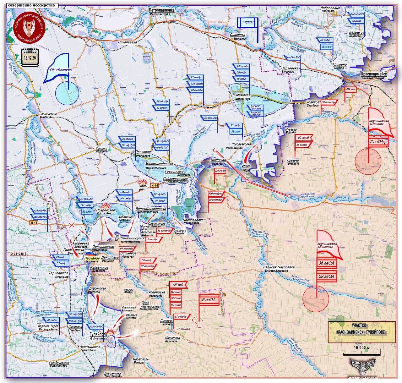 9 декабря ВС РФ освободили н.п. Остаповское. Это продвижение вниз вдоль русла реки Гайчур, во фланг н.п. Андреевка, где противник оборудовал хорошо укрепленный район обороны, явно имеет целью выход на стратегическую трассу Н-15 (Запорожье- Покровское).