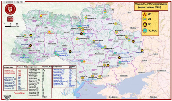 Чтобы получить представление об энергетической системе Украины, приводим графическую иллюстрацию. Данные по мощностям электростанций даны по состоянию на 2016 год. На схеме не показаны солнечные электростанции. Их 7 - общей расчетной мощностью 257,53 Мвт.