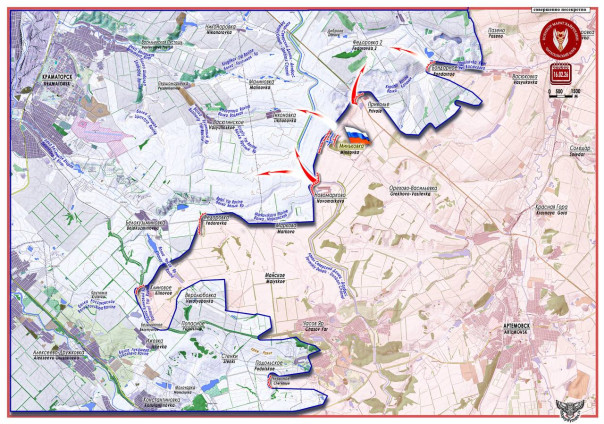Вероятное развитие событий: одновременным продвижением правым флангом в направлении Репяховка - Степок и южнее Покровка по трассе Т-19-18 охватить отсечные позиции противника в районе балок Крещин Яр и Ярки и вынудить ВСУ отойти на рубеж  Угроеды-Михайловское. Далее выйти в район н.п. Михайловское, охватом севернее, организовать огневой, затем и физический контроль над дорогой Угроеды-Краснополье. Одновременно давлением вдоль дороги С-190627 Покровка-Михайловка сковать маневр противника силами и средствами.