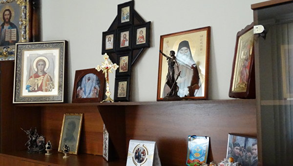 Позади его стула, на котором он сидит за письменным столом, стоят большие флаги ДНР и Российской Федерации. Рядом с ними висит в рамке герб ДНР — двуглавый орел. Слева книжная стенка. Большую часть ее занимает иконостас. Иконы, если не огромные, то довольно-таки большие. Там же стоит много-много томов какой-то энциклопедии темно-коричневого цвета.