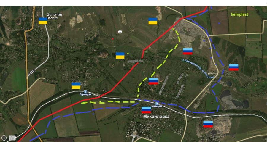 Источники с мест подтверждают данную информацию. В ходе небольшой операции мы перешли вброд речку Камышеваху,заодно подавив несколько вражеских позиций и таким образом полуокружили силы ВСУ меж станцией Марьевка ,речкой Камышеваха и отстойниками ЦОФ Михайловской.Опасаясь окружения противник ретировался в сторону Золотого и станции Горняцкой. Поздней его заняли силы ополчения.Таким образом под полный контроль ЛНР перешел весь поселок Михайловка,а не только его половина,как было ранее.