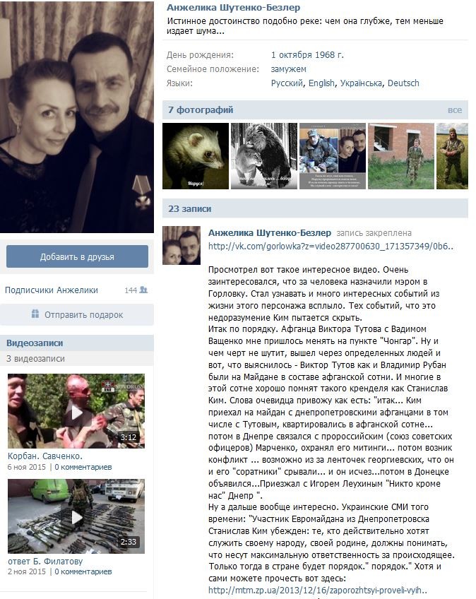 «Просмотрел вот такое интересное видео. Очень заинтересовался, что за человека назначили мэром в Горловку. Стал узнавать и много интересных событий из жизни этого персонажа всплыло. Тех событий, что это недоразумение Ким пытается скрыть», - пишет со слов Безлера его супруга на своей странице ВКонтакте.
