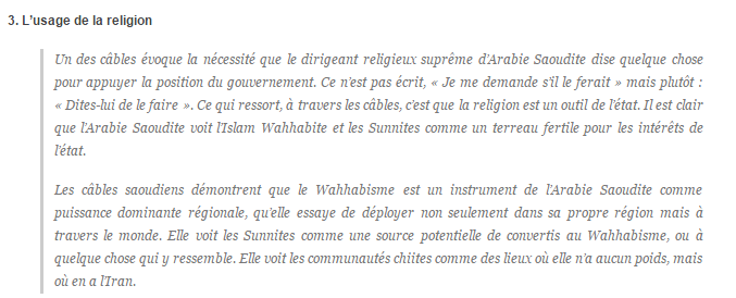 Документ содержит информацию о необходимости использования религии для поддержания позиций элиты саудитов. Подчёркивается, что религия-это инструмент государства. Саудовская Аравия видит ислам суннитов и ваххабитов как плодородную почву для интересов государства.