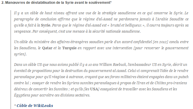 Речь идёт о внешней политике Саудовской Аравии в отношении Сирии. В заключении документа говорится о том, что Башар Асад никогда не простит саудитам их действий в отношении Сирии. Отмечается угроза мести со стороны официального Дамаска, что расценивается, как угроза национальной безопасности. Речь идёт о заключении в 2012 году секретного соглашения между Катаром, Саудовской Аравией и Турцией, которое направлено на совместные действия трёх стран по свержению власти Башара Асада в Сирии.