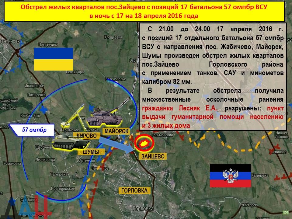Напомним, 17 апреля с позиций 17 отдельного батальона 57 омбр был произведен обстрел поселка Зайцево с применением танков, САУ и минометов калибра 82 мм. В результате обстрела множественные осколочные ранения получила мирная жительница поселка, разрушен пункт выдачи гуманитарной помощи и три жилых дома.