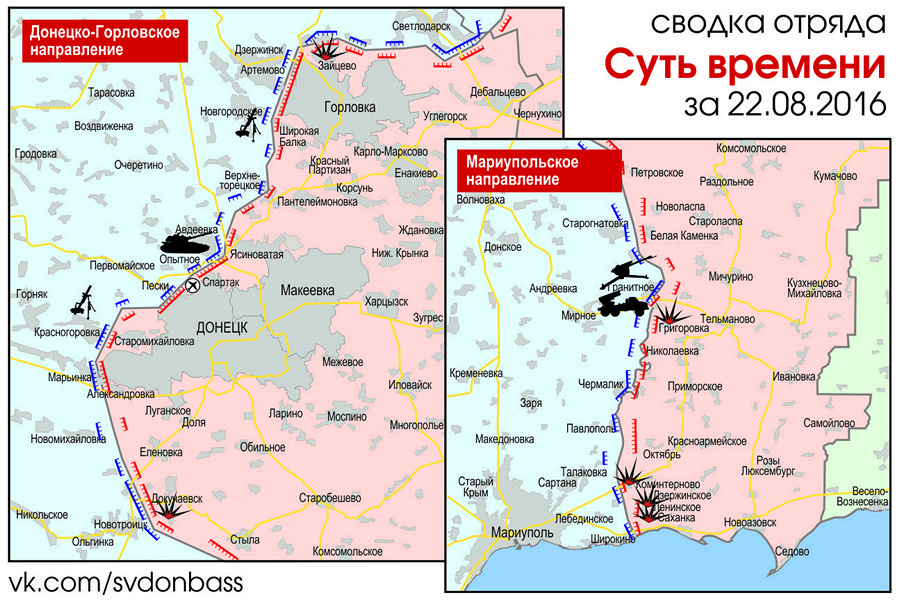 За прошедшую неделю ВСН сильно побило кондиционеры ВСУшникам и нацгвардейцам. Поэтому выходные прошли без серьезных обстрелов. Еще один не маловажный момент, 24 августа заканчивается срок службы солдат призванных в 6-ю мобилизацию. А так как на фронте обострение, а 7-й мобилизация так и не была объявлена, то командование ВСУ продлевает срок службы еще на 2 месяца. В результате в рядах ВСУ и нацгвардии дезертирство и самострелы начинает приобретать массовый характер. Появилась информация, что некоторые подразделения оставили свои позиции на фронте и самовольно ушли, оставляя поломанную бронетехнику и тяжелое вооружение. Сейчас проверяем информацию насчет оставления поселка Пески. Украине нужно как воздух обострение, чтобы ввести военное положение и под это мобилизовать еще украинцев в части ВСУ и Нацгвардии. Ну и конечно, поплакаться всему миру и попросить еще денег на свои преступления
